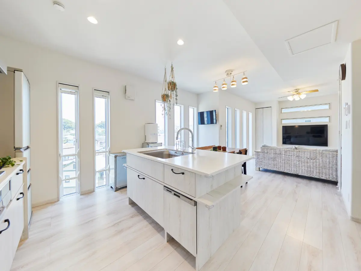 約18.6帖のLDKは二面採光で陽当たり良好、日中は明るく開放的な空間が広がります。