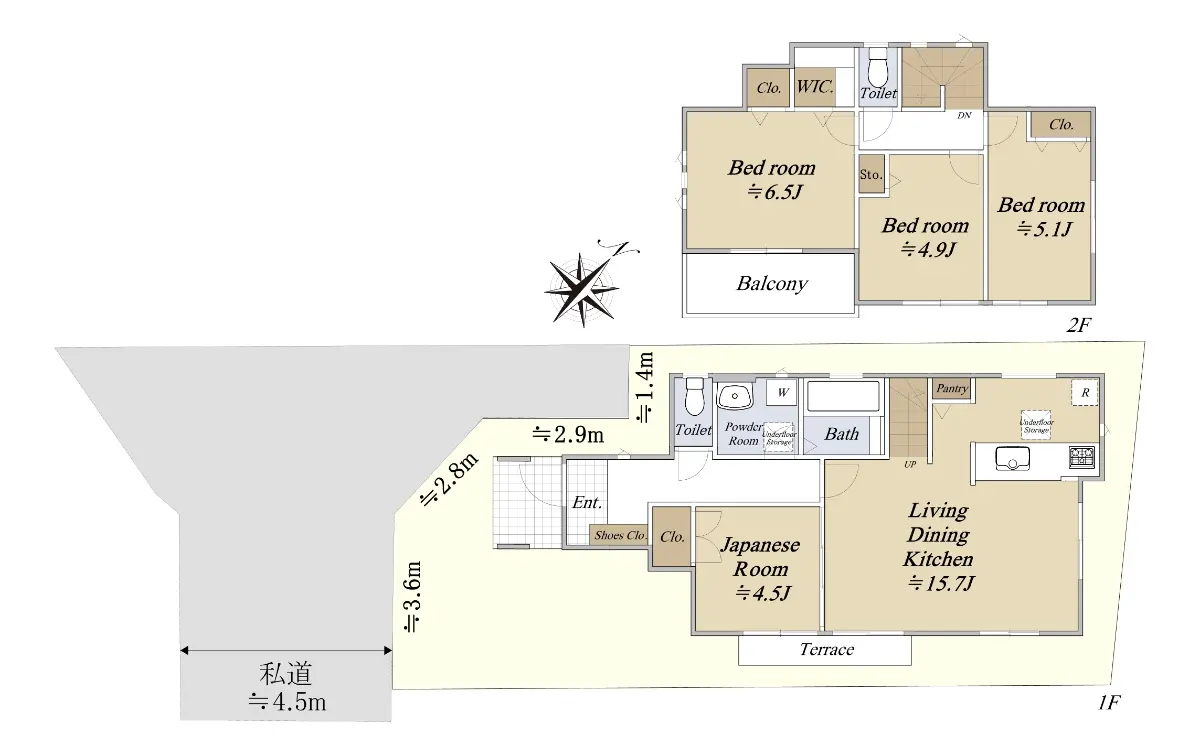 | 接道状況 | 一方道路・南西4.5m(私道)接面10.7m |