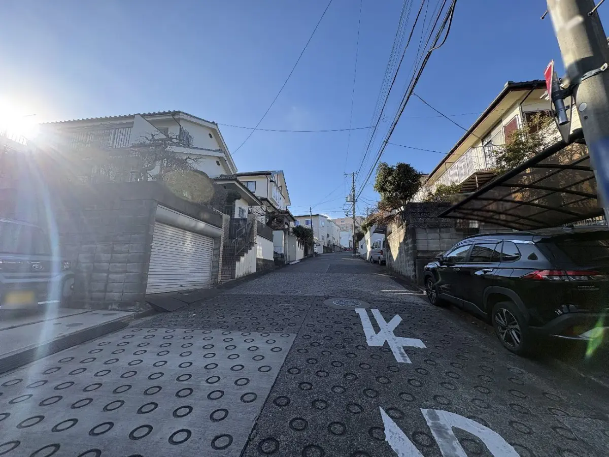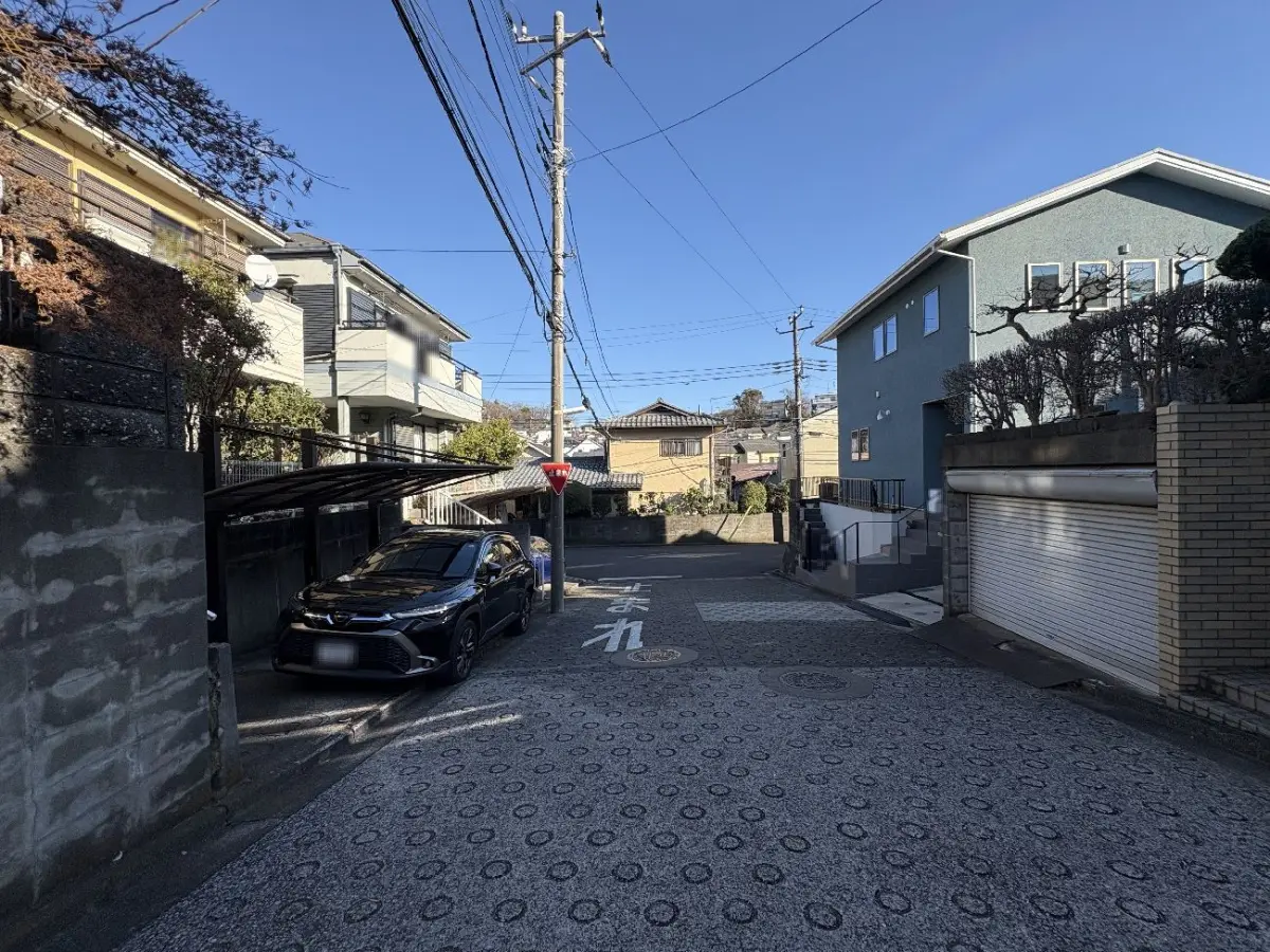 前面道路幅員約6.5mのため、開放的で車の出し入れもし易いです。