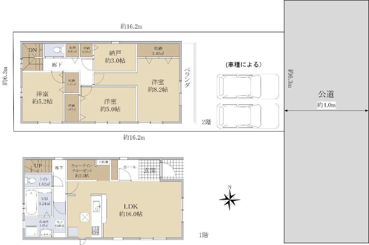 ・2階:洋室にクローゼット、廊下に収納