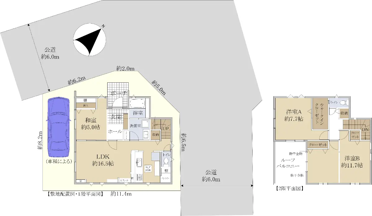 □北東側約6.0m公道、北西側約6.0m公道に面する角地