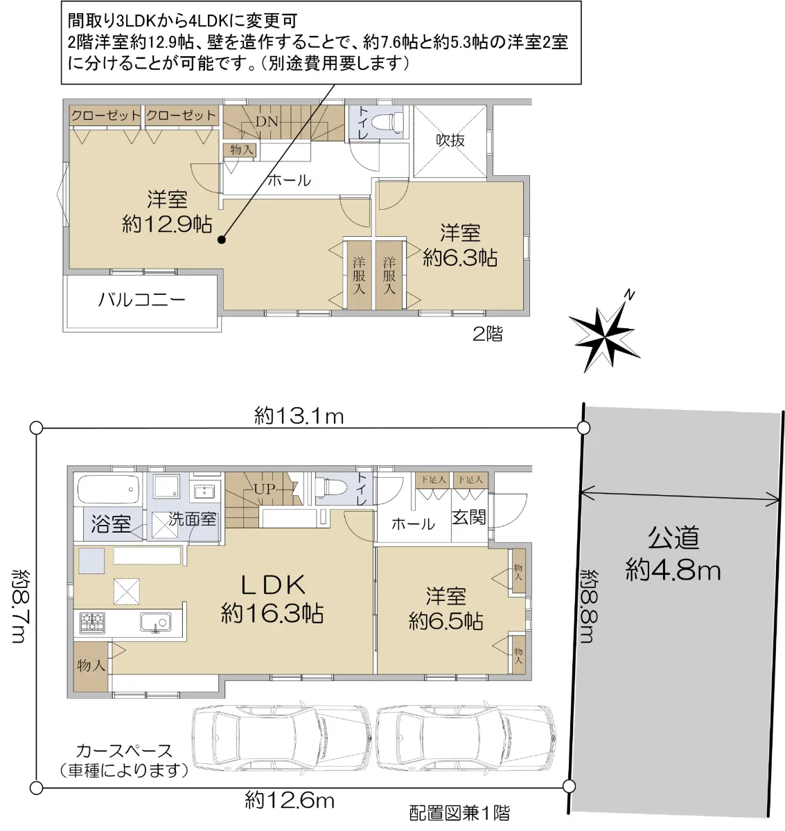 前面道路公道です。幅員が約4.8mあり、車の駐車もしやすいです。