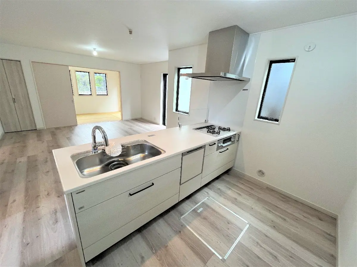 約17.5帖の広々としたLDKは、キッチンからリビングを見渡せる対面式キッチンとなっております。