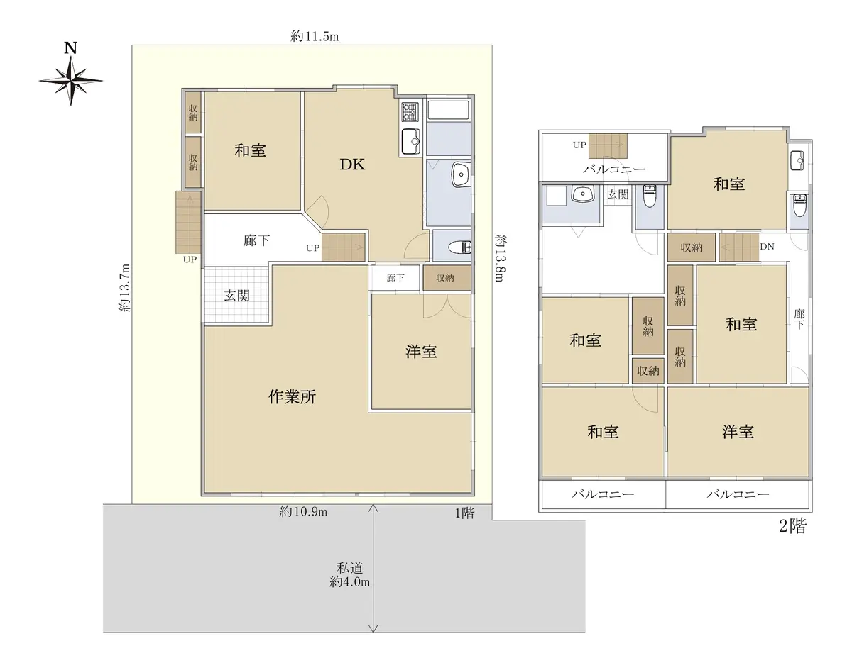 | 接道状況 | 一方道路・南4m(私道)接面10.9m |
