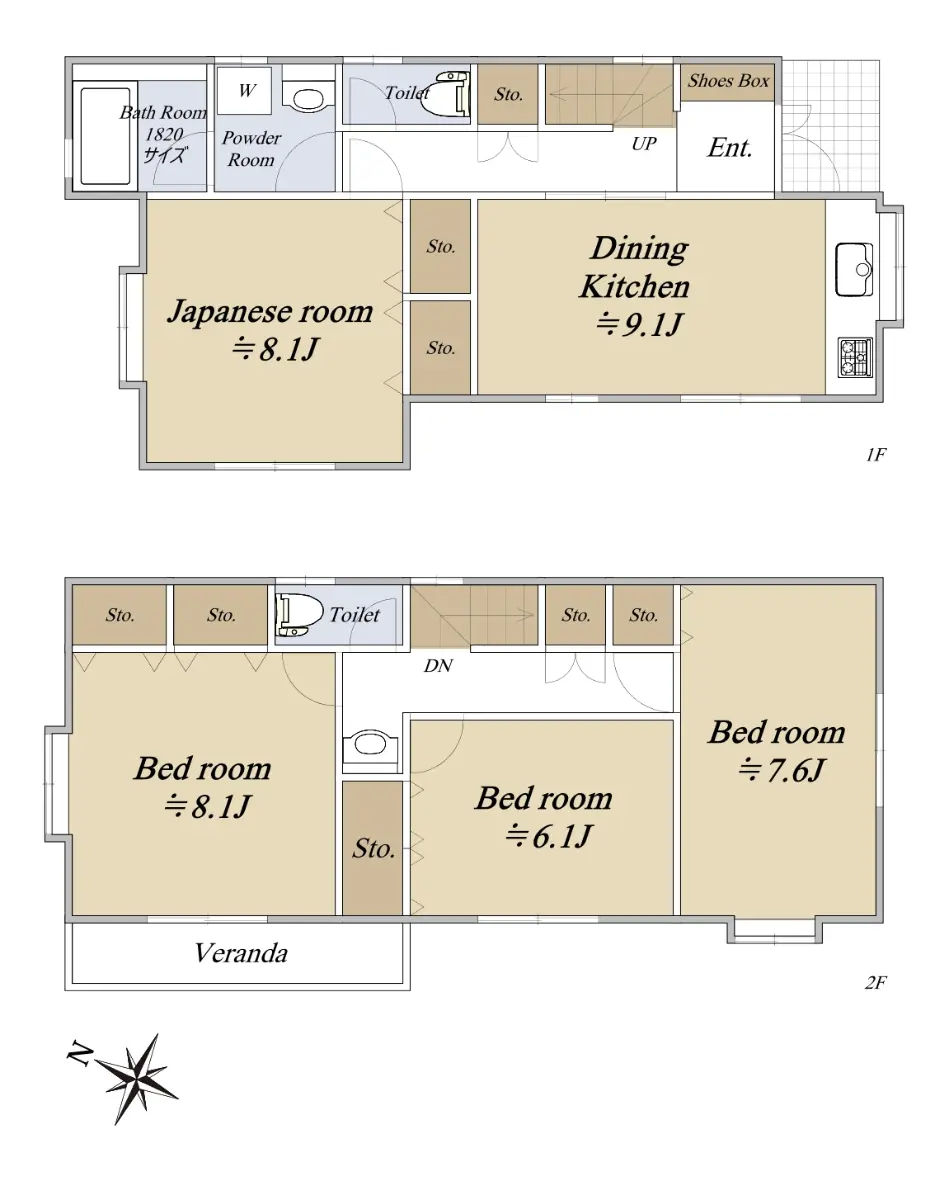 1階(和室約8.1帖、DK約9.1帖)2階(洋室約8.1帖・約7.6帖・約6.1帖)