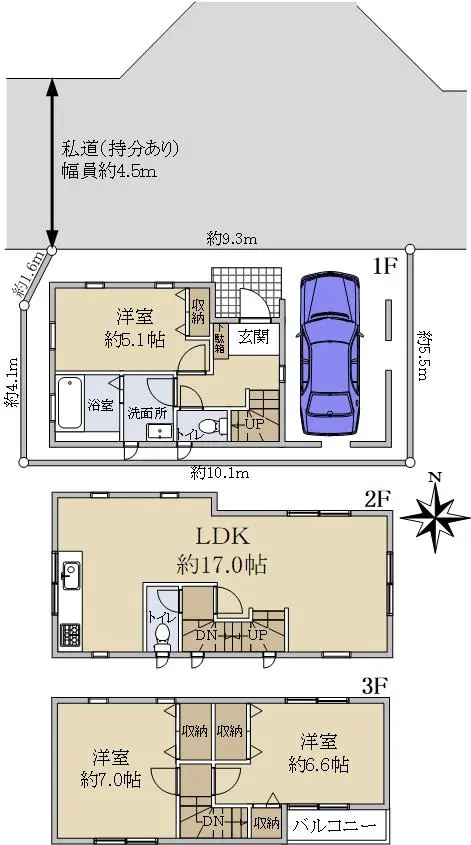 | 接道状況 | 一方道路・北4.5m(私道)接面9.3m |