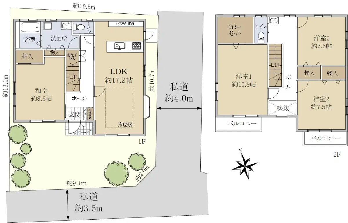 | 接道状況 | 角地・南3.5m(私道)接面9.1m/東4m(私道)接面12.7m |