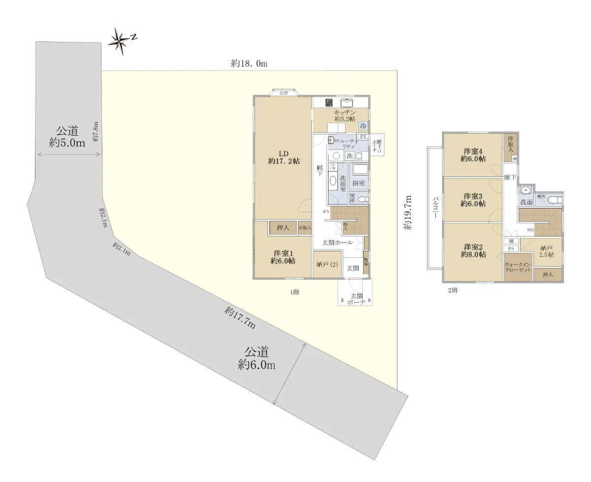 | 接道状況 | 角地・南東6m(公道)接面17.7m/南西5m(公道)接面7.8m |
