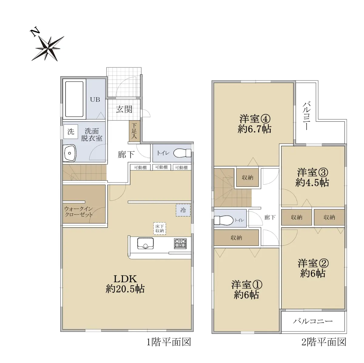 建物は一建設施工の物件となり、家族が揃うLDKは約20.5帖あり、2階には洋室が4部屋ございます。