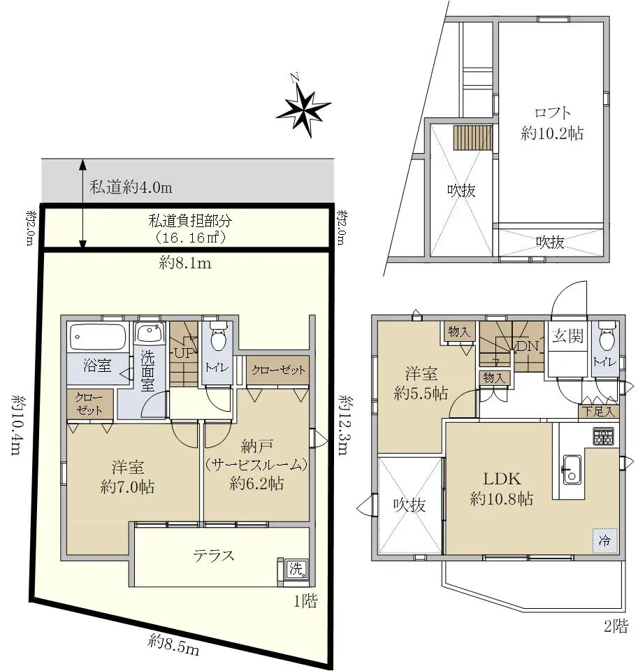 | 接道状況 | 一方道路・北4m(私道)接面8.1m |