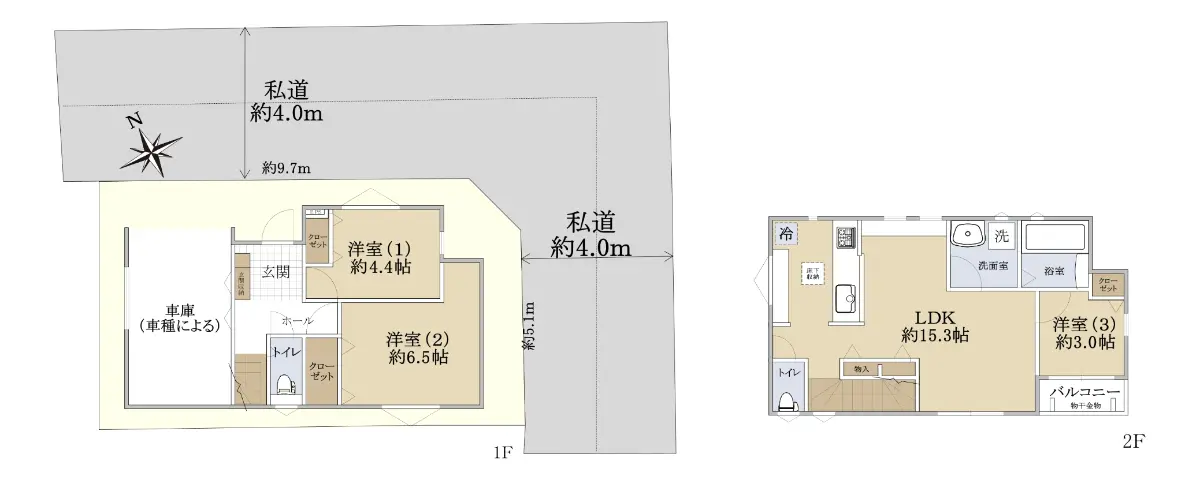 | 接道状況 | 角地・北東4m(私道)接面9.7m/南東4m(私道)接面5.1m |