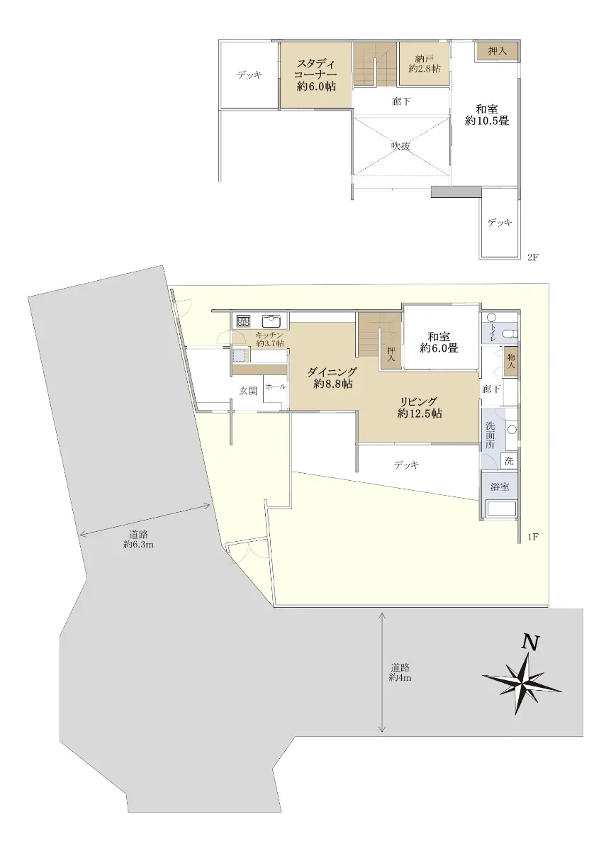 | 接道状況 | 角地・西6.3m(公道)接面12.4m/南4m(公道)接面12.5m |