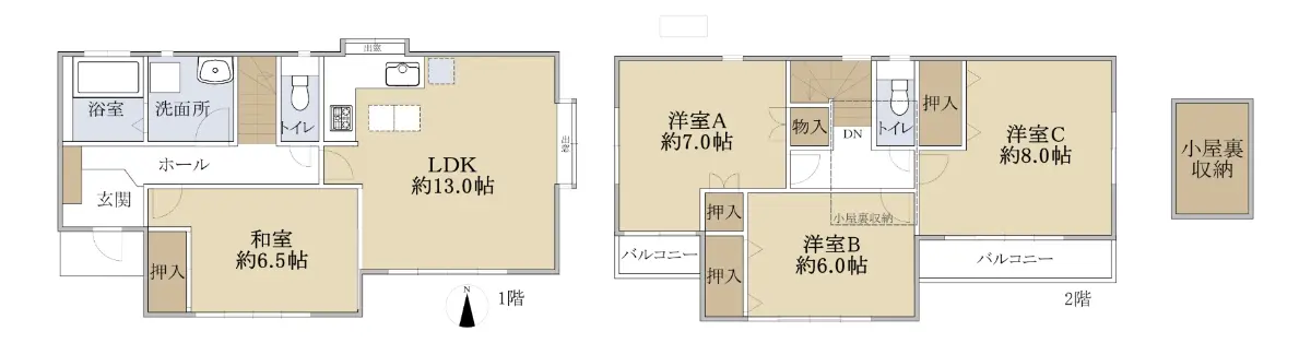 居室は4部屋あり、2階東側の洋室は約8.0帖に南側バルコニー、