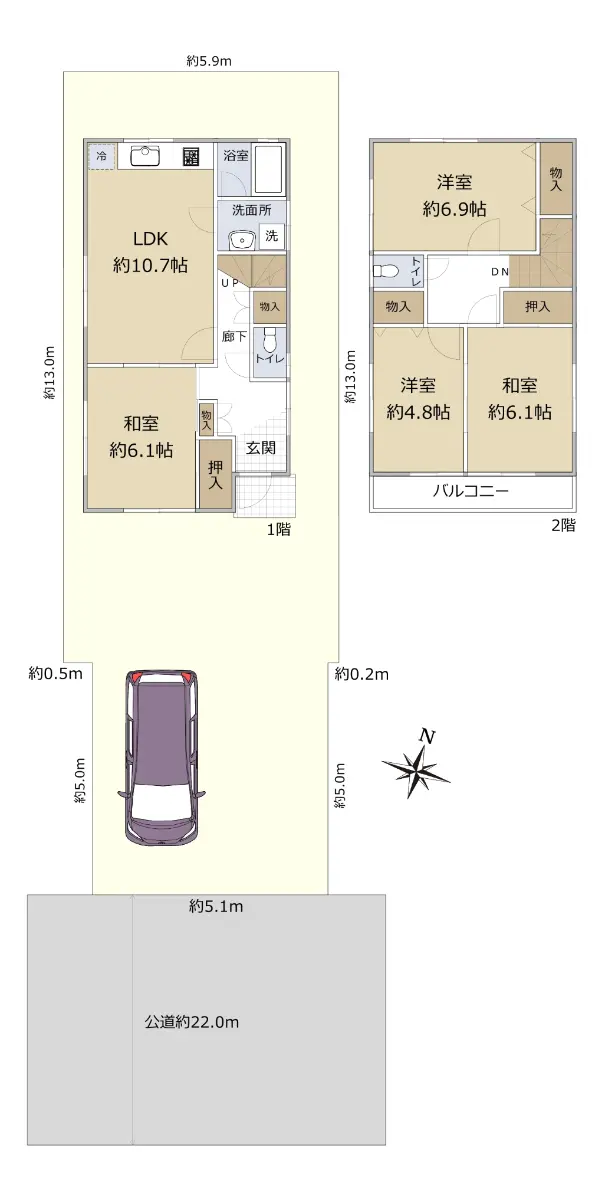 | 接道状況 | 一方道路・南東22m(公道)接面5.1m |