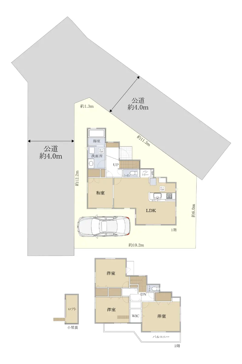 | 接道状況 | 角地・北4m(公道)接面11.3m/西4m(公道)接面12.2m |