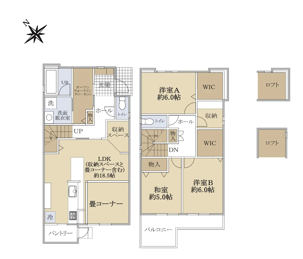 大容量の玄関横オープンWIC、1階収納スペース、パントリー、2階ロフト×2、2階WIC×2