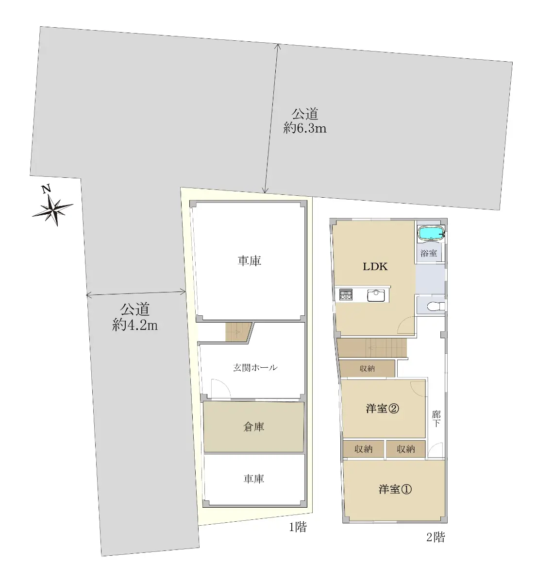 | 接道状況 | 角地・北東6.3m(公道)接面6.9m/西4.2m(公道)接面15.3m |