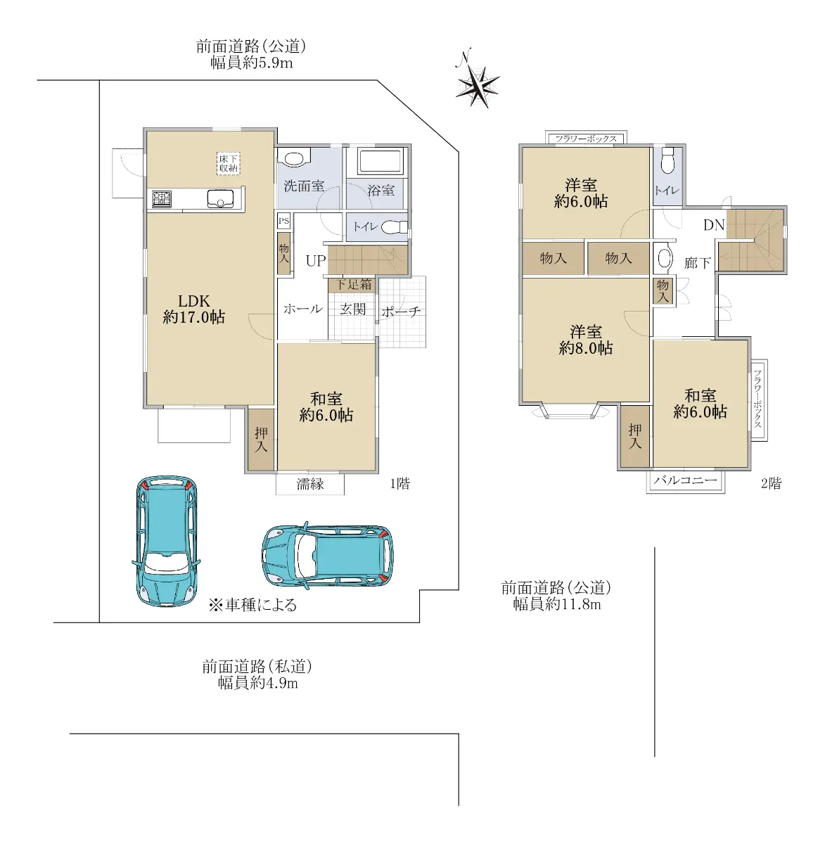 | 接道状況 | 角地・南西4.9m(私道)接面9.6m/南東11.8m(公道)接面12.3m |