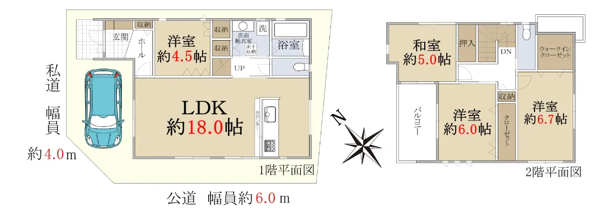 | 接道状況 | 角地・南西6m(公道)接面5.8m/北西4m(私道)接面9.5m |