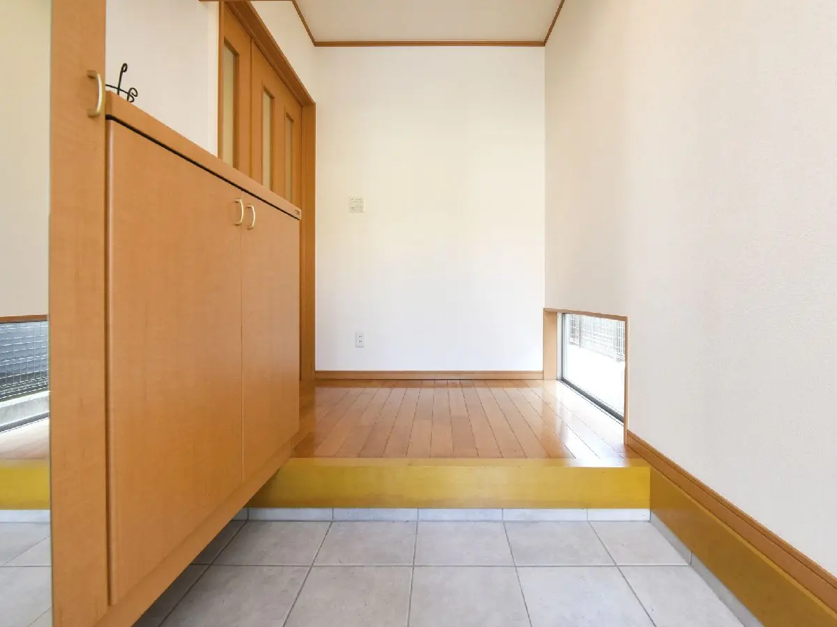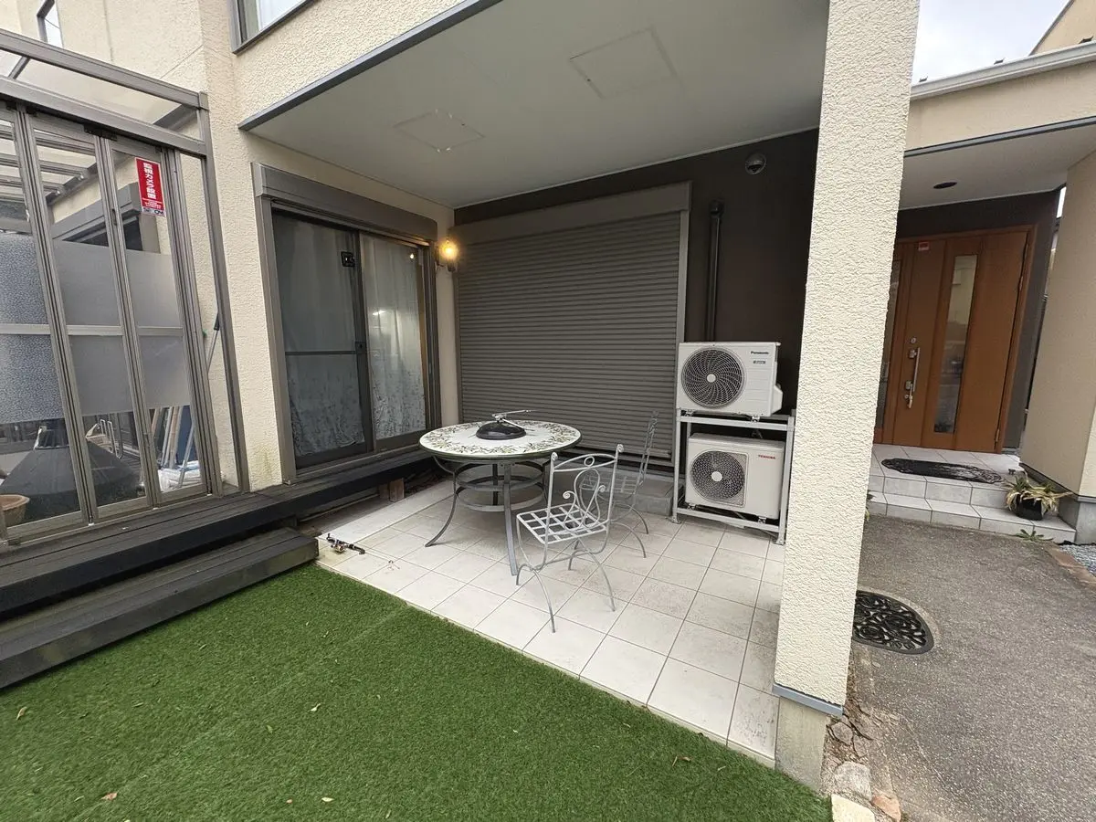 タイル敷きのテラスとサンルームのあるお家です。洗濯物を干したり、お庭時間をお楽しみいただけます。