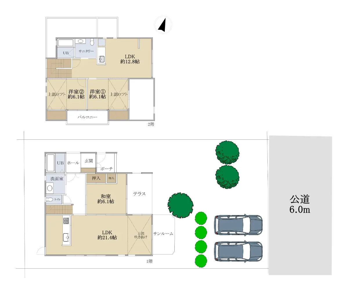 ●カーポート2台分・カースペース1台分有(車種による)