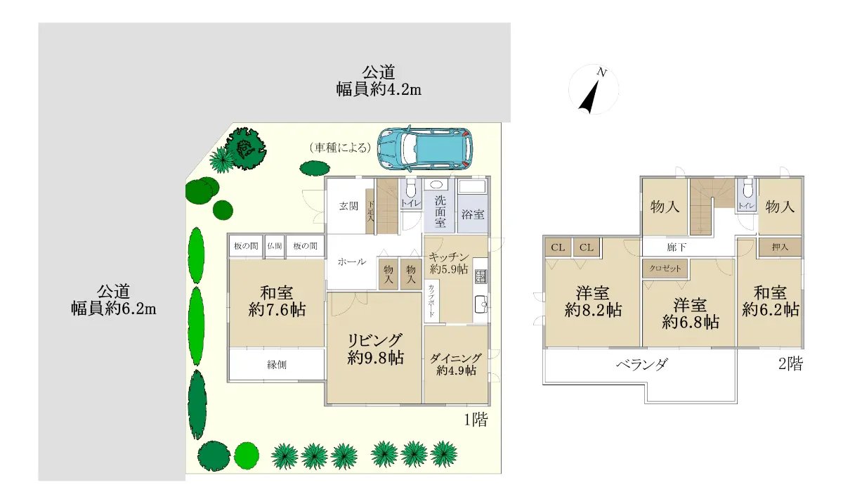 | 接道状況 | 角地・北西4.2m(公道)接面11.8m/南西6.2m(公道)接面12.2m |