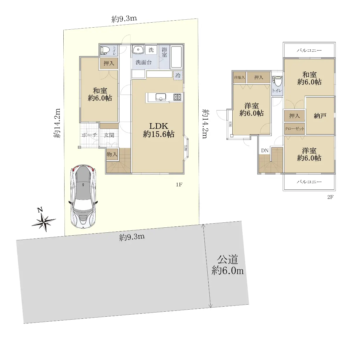 | 接道状況 | 一方道路・南6m(公道)接面9.3m |