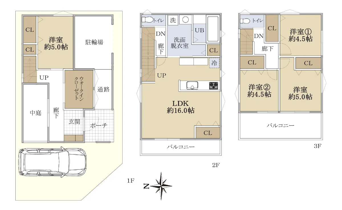 1階には、ウォークインスルークローゼット、中庭、駐輪場もございます。