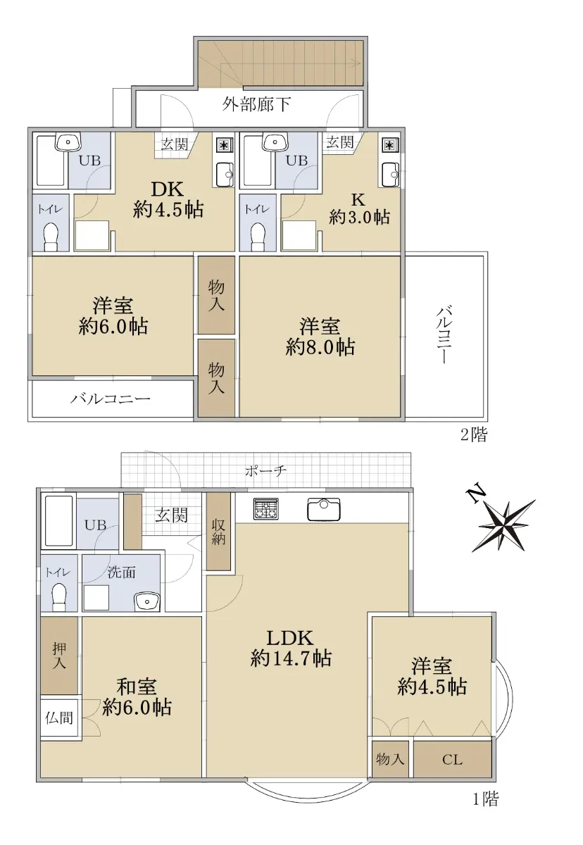 ◆間取り:1階2LDK・2階1DK、1K