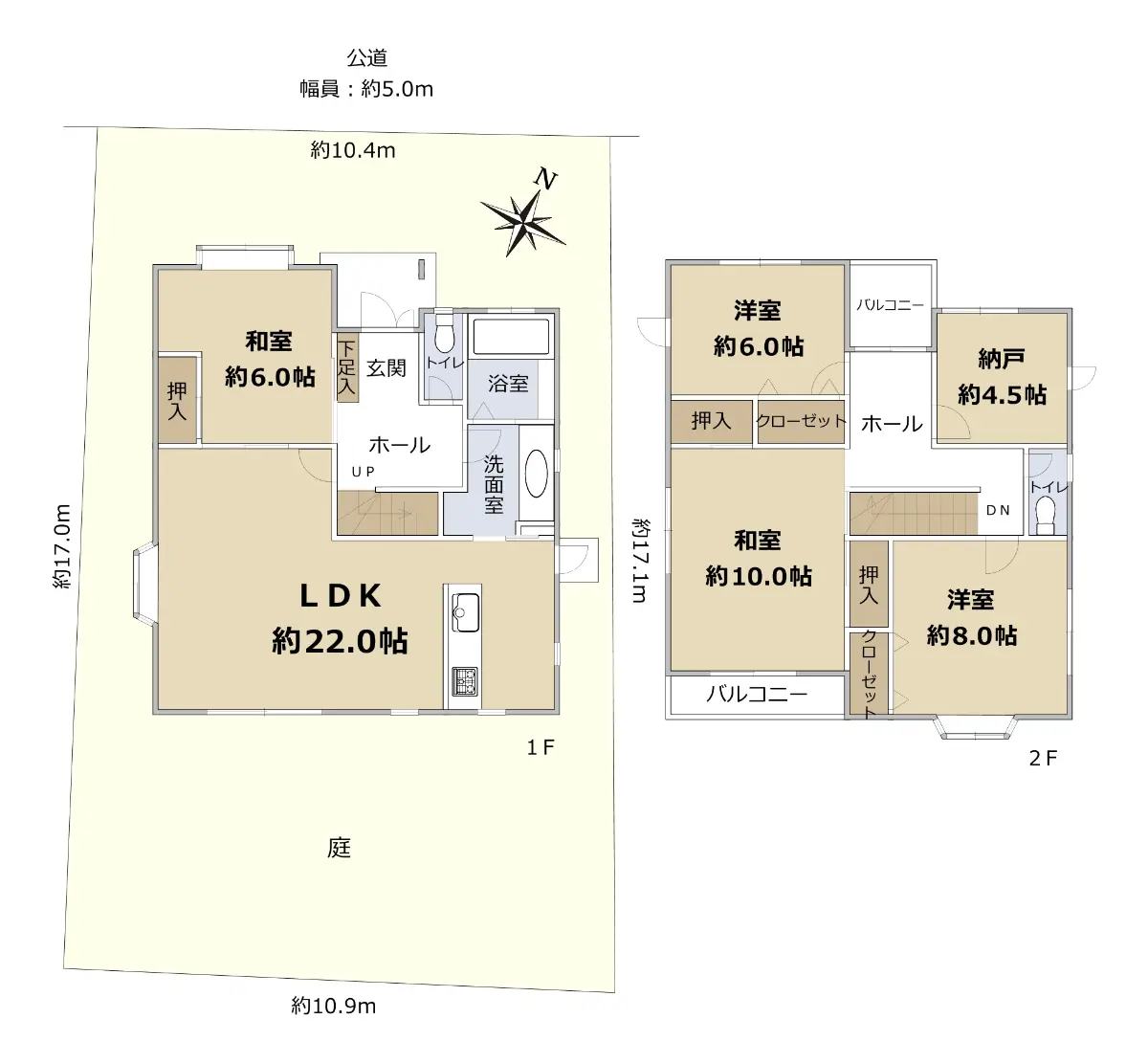 | 接道状況 | 一方道路・北5m(公道)接面10.4m |