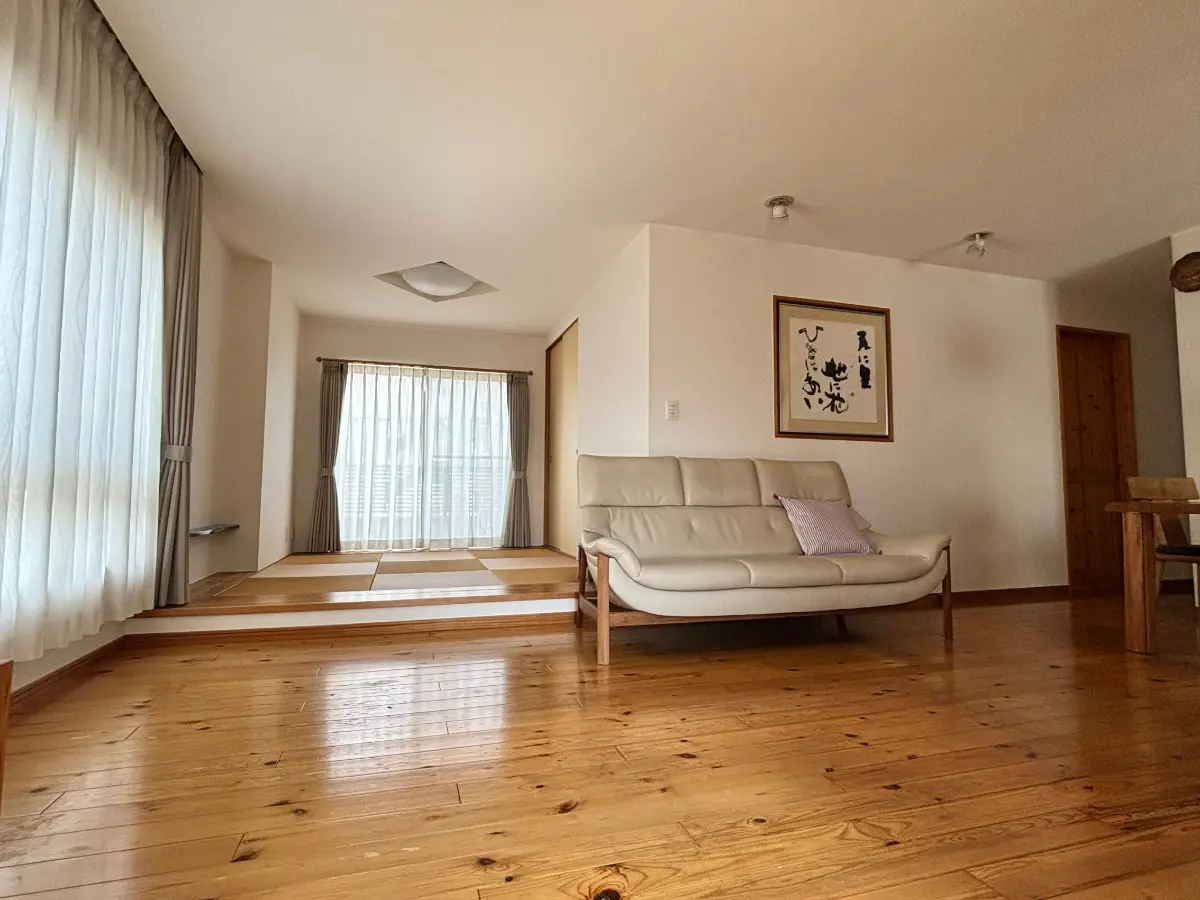 二階リビングダイニングキッチンは建具、フローリングは無垢材仕様