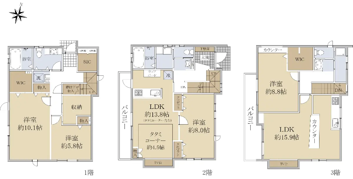 3階:LDK、洋室、ウォークインクローゼット、洗面台、トイレ、キッチン、バルコニー