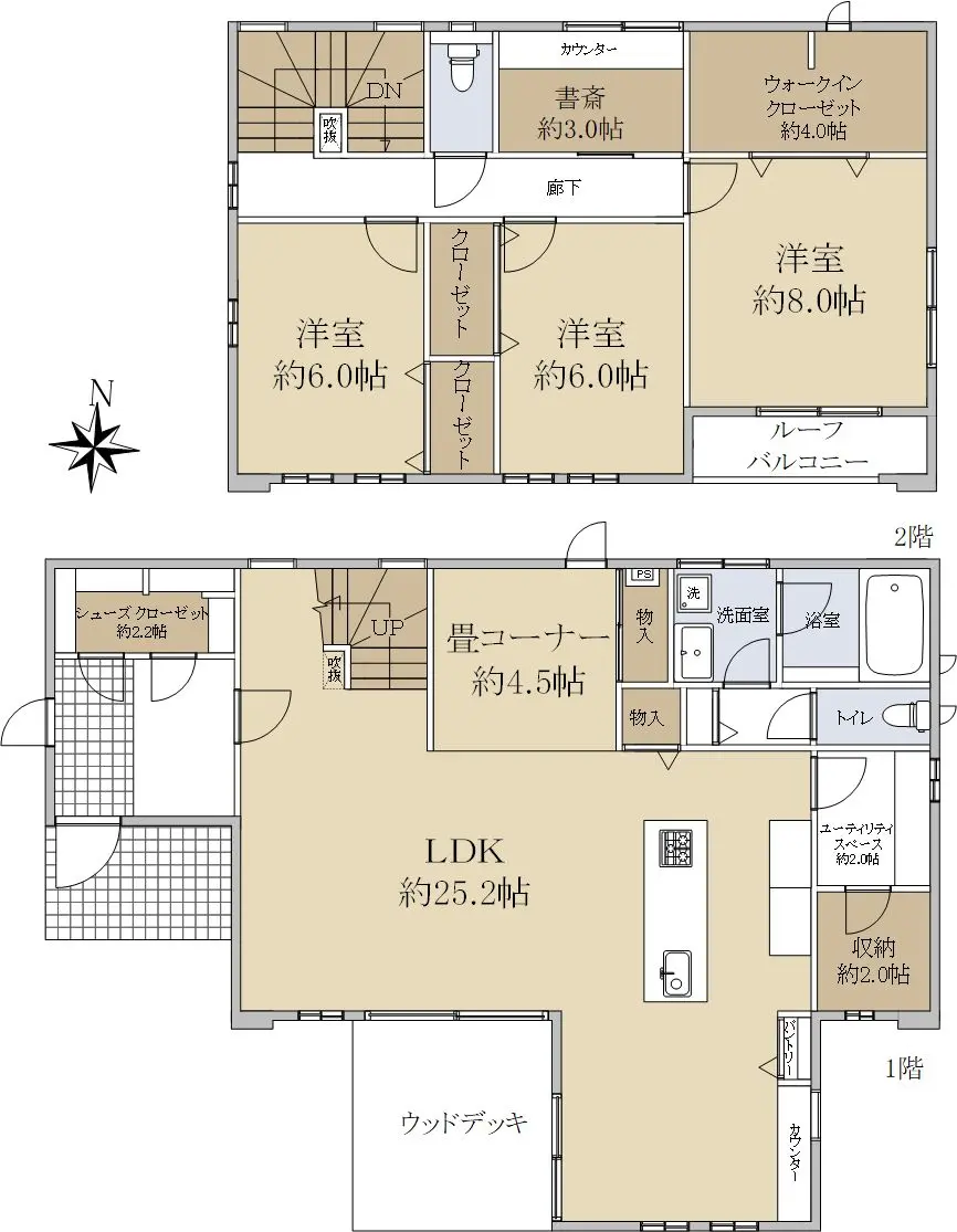 LDKは約25.2帖もあり、南側に開口部、ウッドデッキが設けれらており、