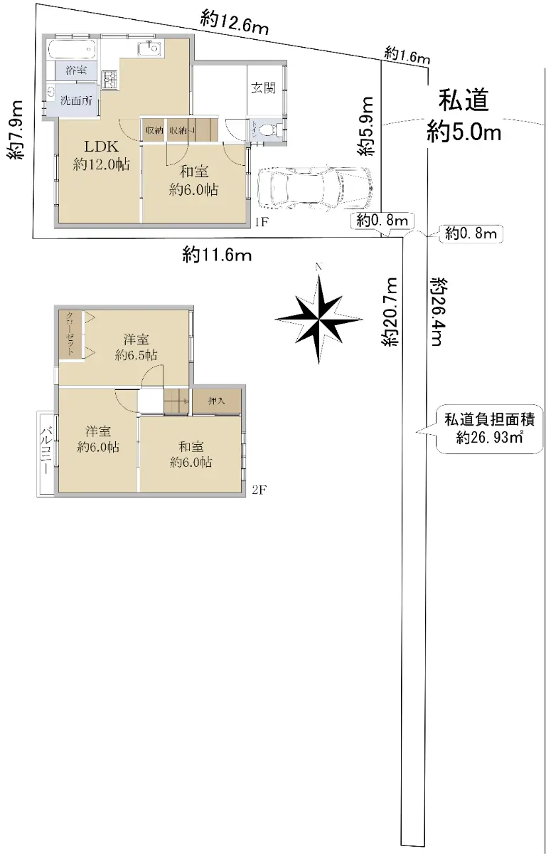 | 土地面積 | 81.47m2(約24.64坪)/他に私道負担:26.93m2あり |
