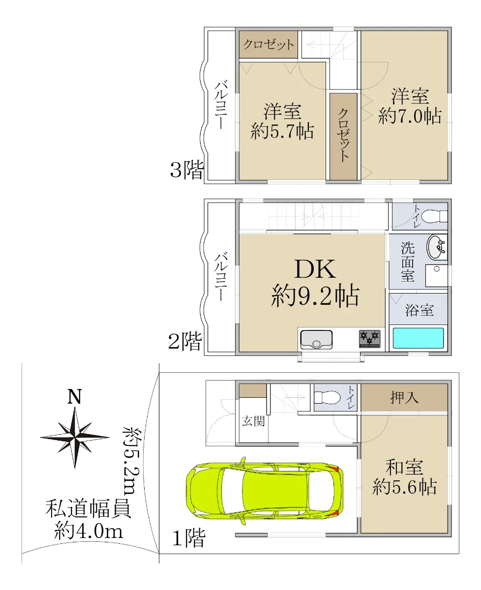 | 接道状況 | 一方道路・西4m(私道)接面5.2m |