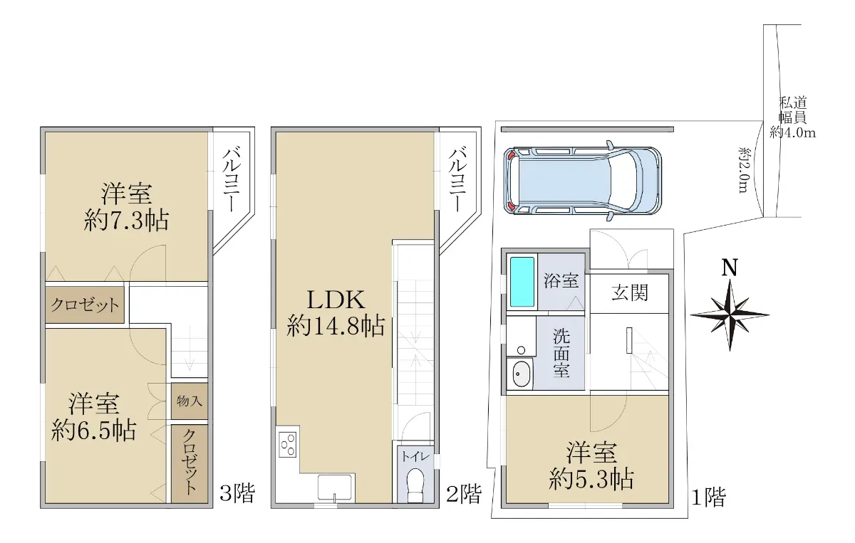 | 土地面積 | 40.78m2(約12.33坪)※公簿/他に私道負担:9.98m2あり |