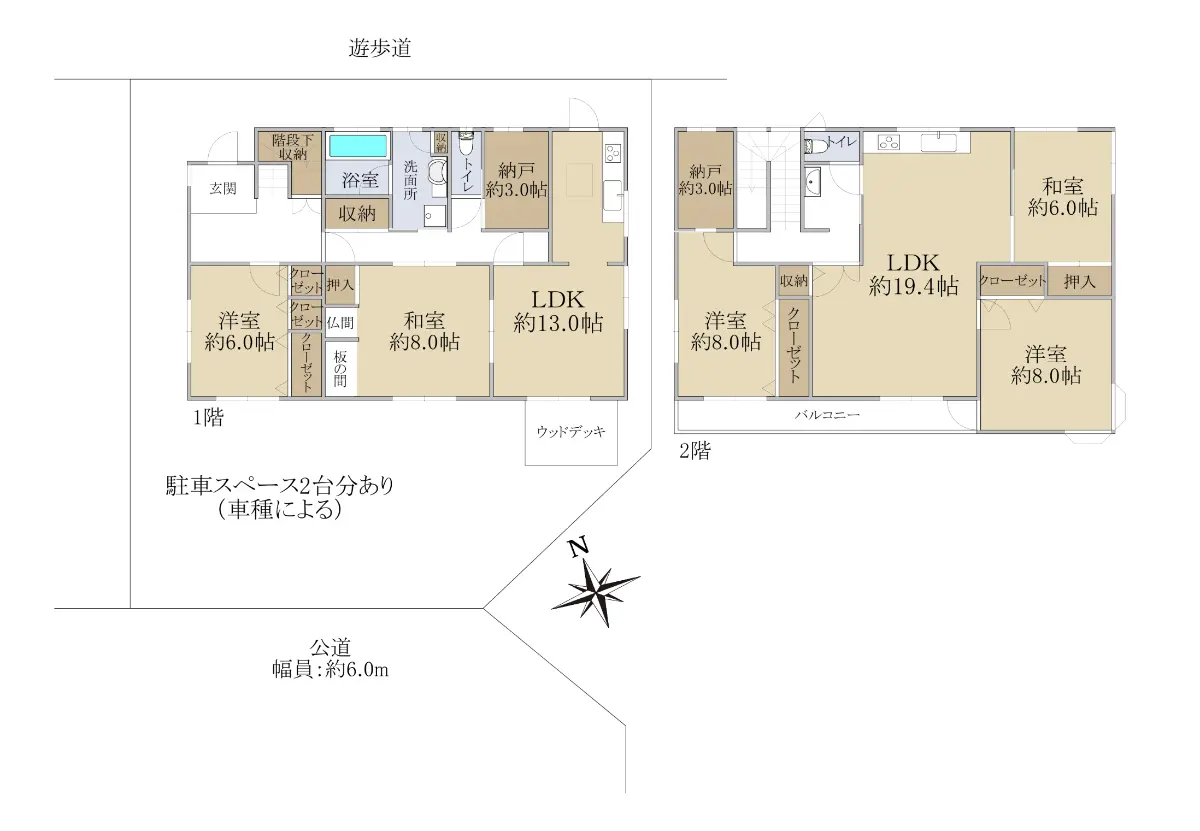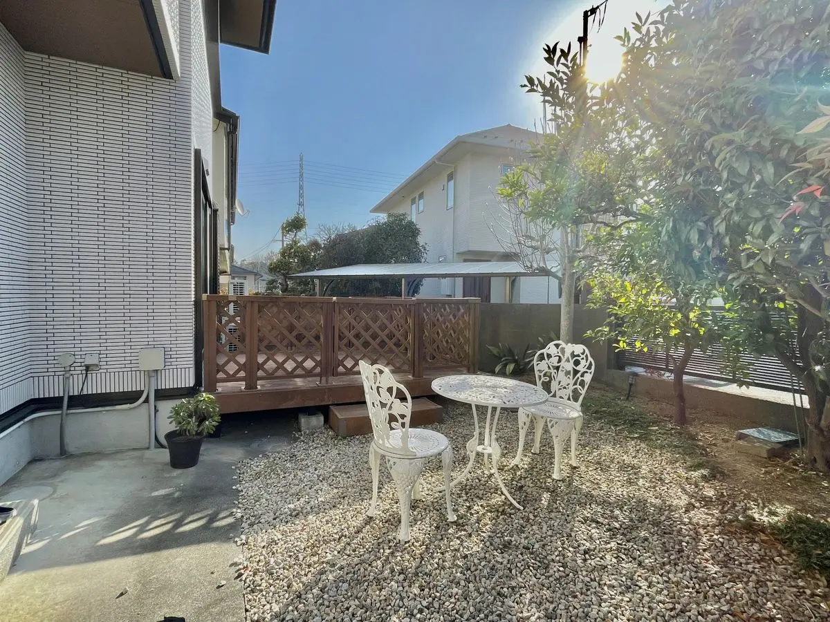 駐車スペースが2台あり、南側にはウッドデッキ付きの庭があります。