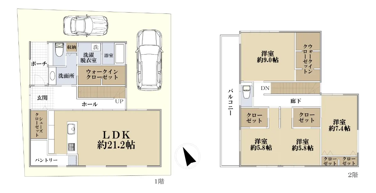 延べ床面積45.21坪の広々とした木造2階建の4LDKの間取りです。