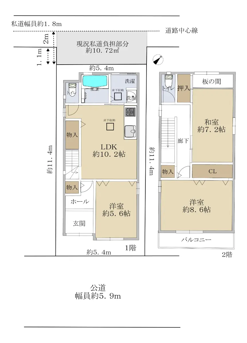 | 接道状況 | 二方道路・南東5.9m(公道)接面5.4m/北西2.9m(私道)接面5.4m |