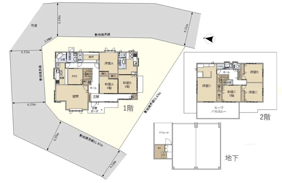 | 接道状況 | 三方道路・東6.1m(公道)接面25.6m/北6.1m(公道)接面9.1m/西6.2m(公道)接面14.4m |