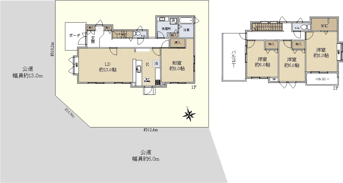 | 接道状況 | 角地・南6m(公道)接面12.4m/西13m(公道)接面10.2m |