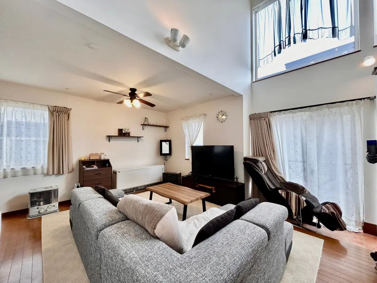 リビングは南東向きで吹き抜けがあり、陽当たりが良好で解放感もあります。