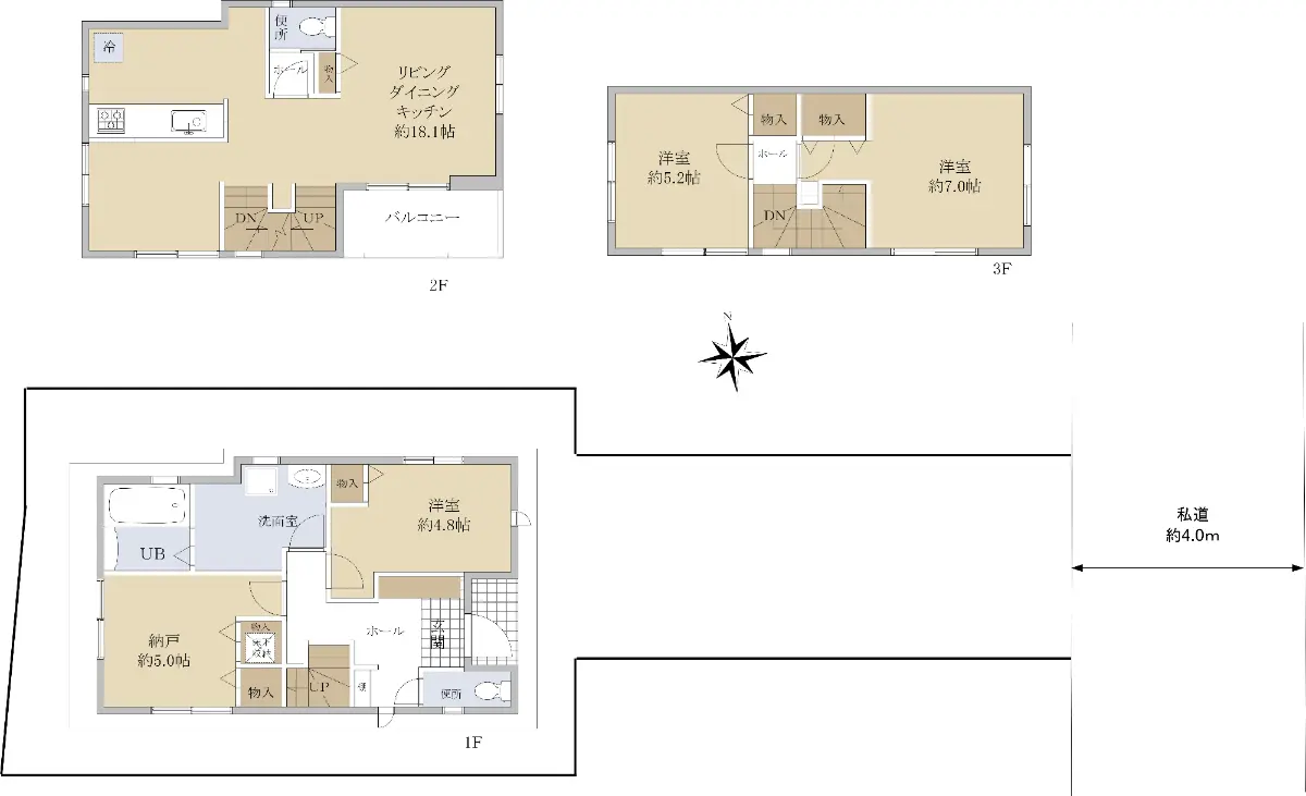 | 接道状況 | 一方道路・東4m(私道)接面3.1m |