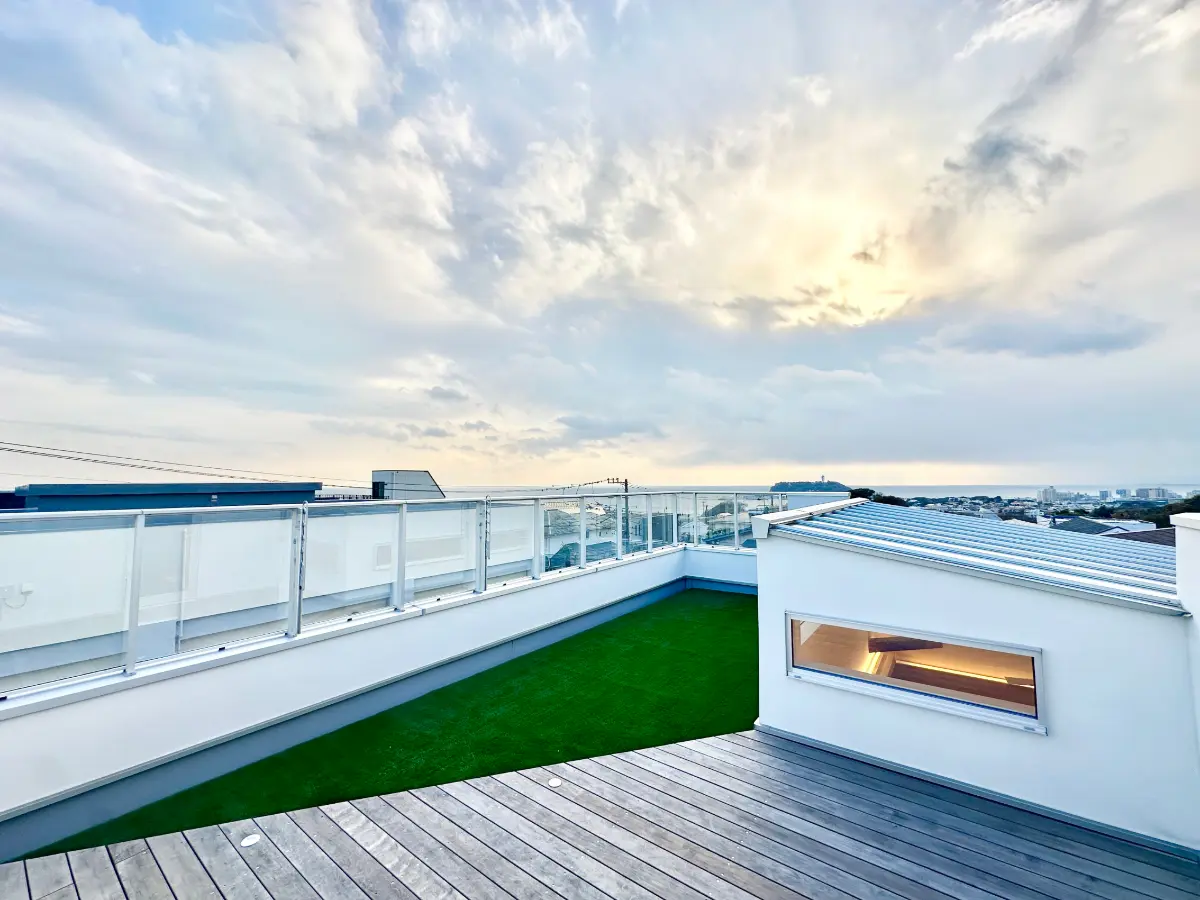 ルーフバルコニーから江ノ島を望むLDK約39帖の戸建