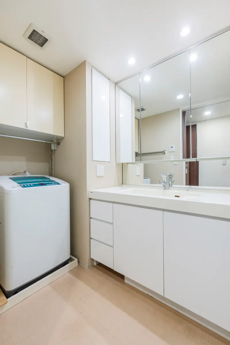 三面鏡裏収納/人工大理石洗面ボウル/ヘルスメーター収納/リネン収納