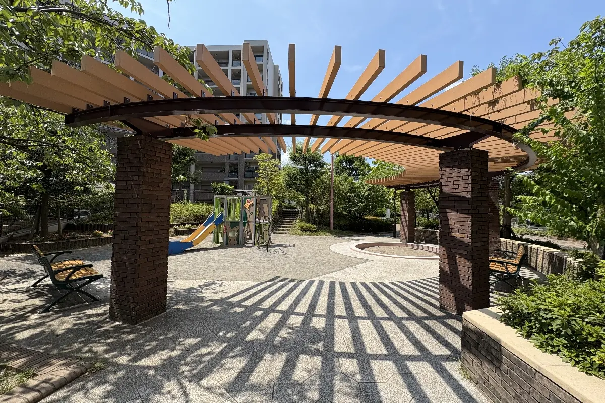 マンション敷地内にはプレイロットや保存緑地があり、自然豊かな環境です。共用廊下からは保存緑地が見え四季を感じられます。