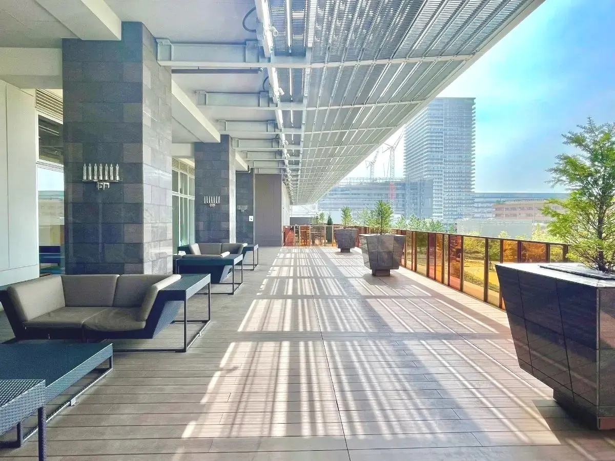 壮大なセンターコートや正面に広がるさくらの森を望める屋外空間