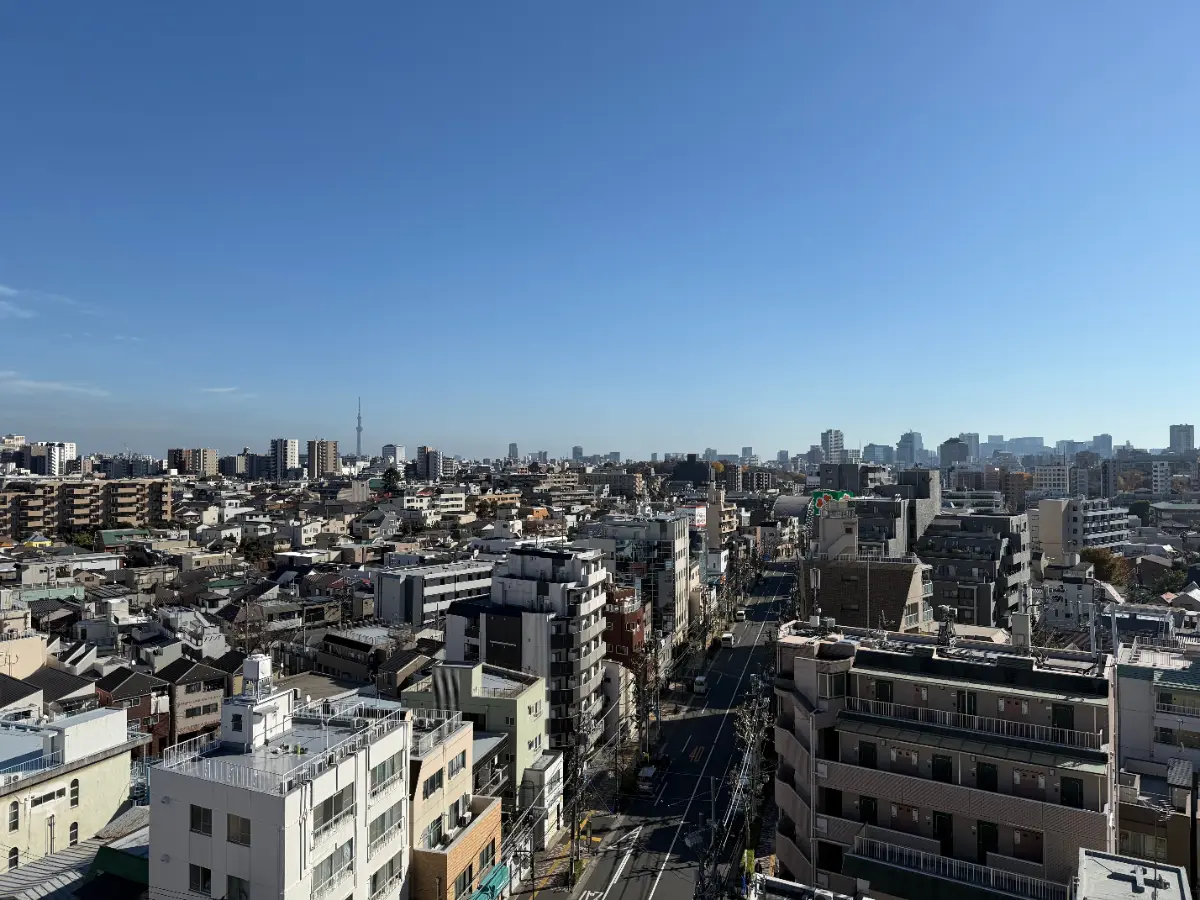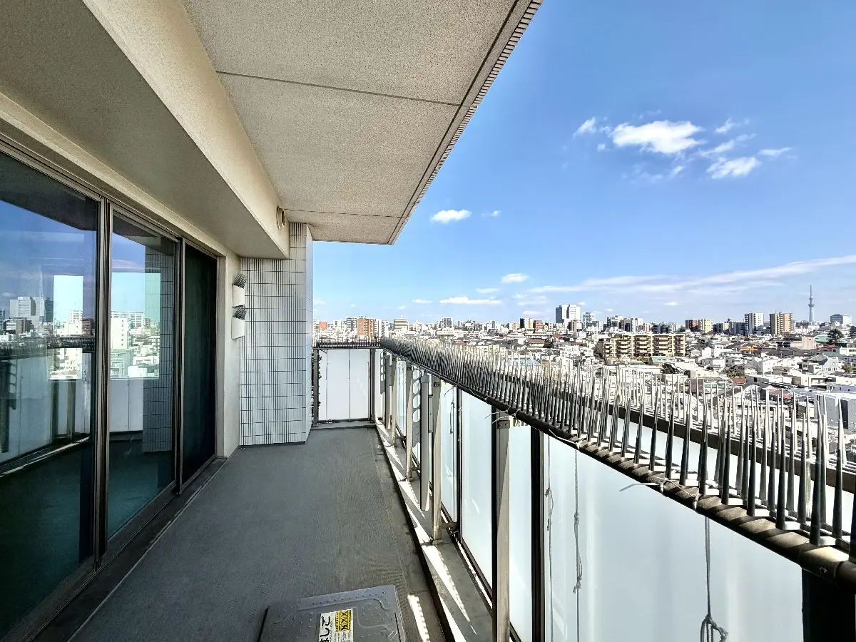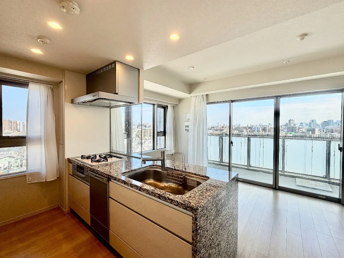 地上12階建て10階部分、南東、北東、北西の3方角部屋のため三面採光で、陽当たり、通風ともに良好です。