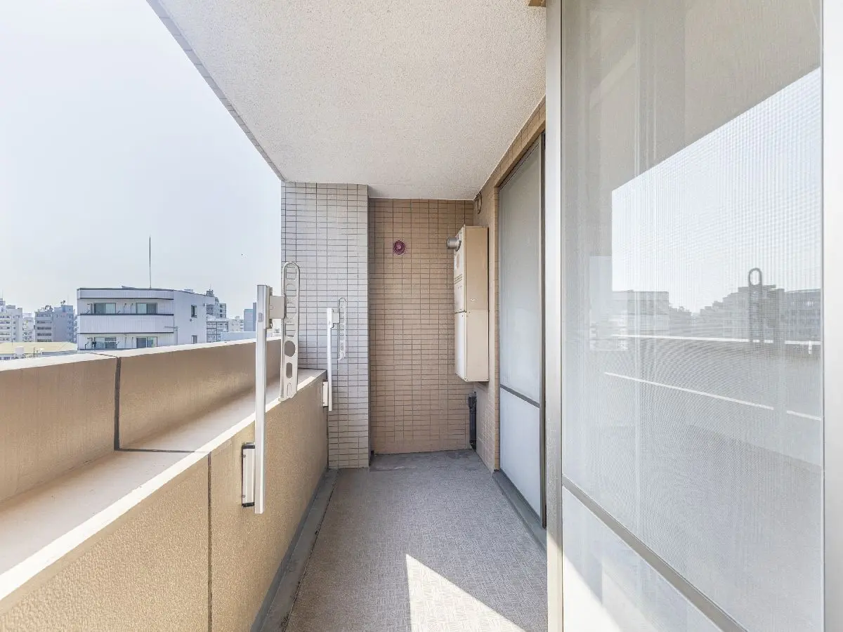 ベランダや非常階段を含む建物全体のタイル貼り仕様は耐久性や安全性に優れます。