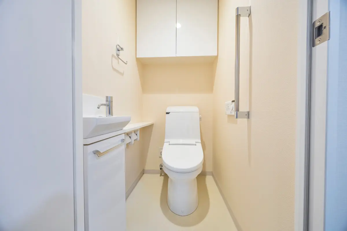 手洗いカウンター付トイレ/吊戸棚収納/温水洗浄機能付暖房便座